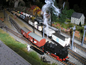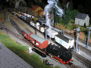 Bauzustand I (2000 - 2004)Im Rahmen der historischen Modelleisenbahnausstellung vom 1.Dezember 2000 bis 8.Januar 2001 sollte in der Badstube Wangen unter Anderem auch eine Eisenbahnanlage zur Geschichte der Eisenbahn in Wangen ausgestellt werden. Wir als Modellbahnverein erhielten daher von der Stadt Wangen den Auftrag, eine 7,0m x 1,5m große H0-Modellbahnanlage zu erstellen, welche die Zeit der Dampflokomotiven im Wangener Bahnhof wiederspiegeln sollte. Dies war bis Anfang der 70er Jahre der Fall.Die Anlage ist in zwei Ebenen aufgebaut, wobei der obere Teil die Gleisanlage des Wangener Bahnhofs darstellt und die beiden Strecken nach Kißlegg und Hergatz in einem Schattenbahnhof in der unteren Ebene enden. Besonders gut gelungen sind dabei die Gebäude von Paul Heinl, er erbaute den Bahnhof, die Güterschuppen und das alte WLZ-Lagerhaus.Nach Ende der Ausstellung ging die Anlage wider Erwarten durch Schenkung der Stadt in den Vereinsbesitz über, und seither wurde die Anlage auf verschiedenen Messen gezeigt.